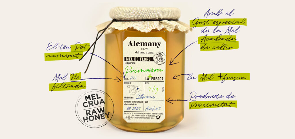 La mel crua o mel fresca és mel acabada de collir, la de la darrera floració, extreta d’un paisatge floral concret, amb unes característiques organolèptiques singulars. Es tracta d’un concepte de mel “raw” que posa l’accent en la puresa del producte i en el respecte a l’origen de la flor de temporada així com al seu envàs, sempre de vidre, que en vol subratllar el color i la textura. Els subscriptors obtindran una mel exclusiva acabada de collir, que conserva la intensitat de gust i l'olor de la mel fresca i amb un tractament molt suau. De la mateixa manera, la marca vol fomentar el consum de mel dels apicultors del país, dels quals Alemany en fa una selecció acurada.