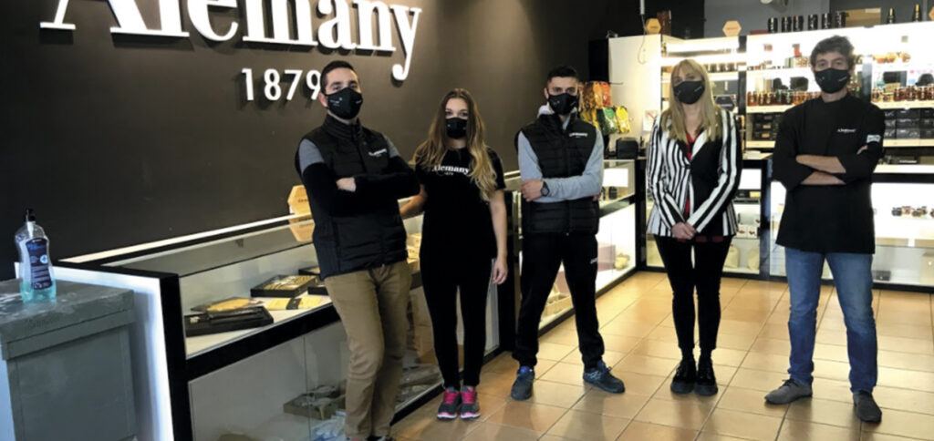 D'esquerra a dreta els tres guaites de la setmana a la botiga d'Alemany a Os de Balaguer: David Melero, Marina Viza i Sergi Fortuny; l'advocada especialitzada en seguretat alimentària Marta Quintana i Ferran Alemany, gerent de Torrons i Mel Alemany. Foto: Berta Palau.
