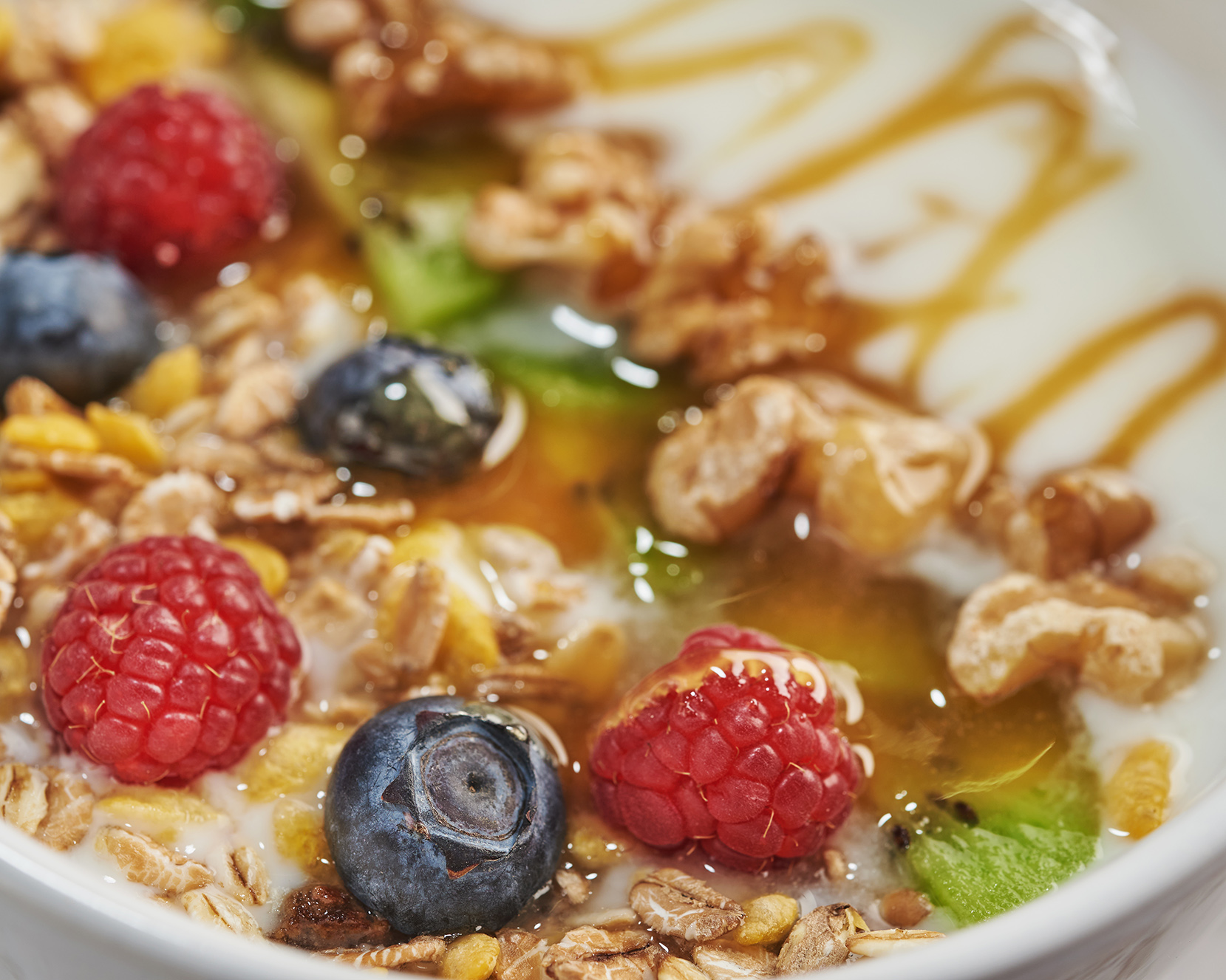 Bol de iogurt amb civada, fruita i mel amb pol·len, gelea reial i pròpolis