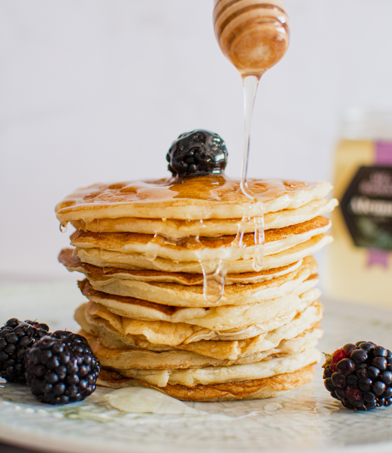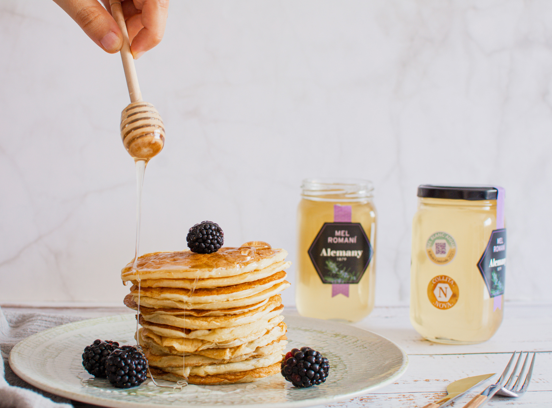 6. Servim els pancakes amb un raig de Mel de romaní Alemany i amb les fruites que més ens agradin!