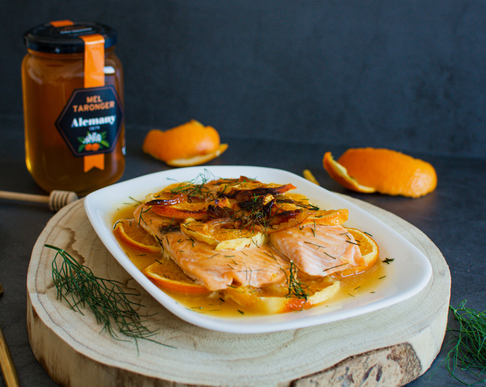 2. Barregem el suc de taronja amb dos cullerades de Mel de taronger Alemany, l’anet i una mica de sal i pebre.
