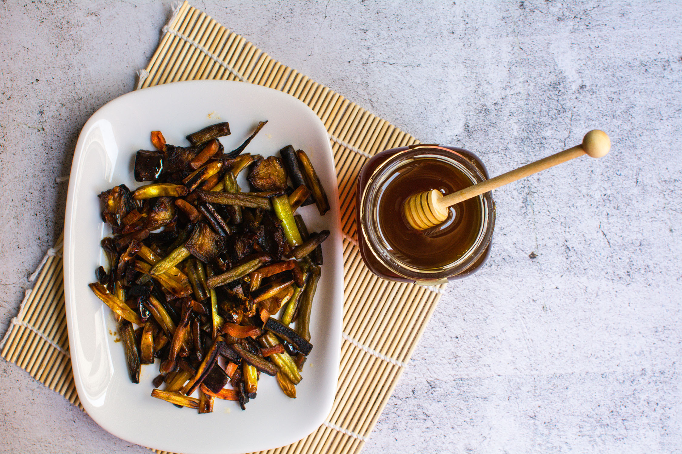 3. Afegim al saltejat dues cullerades soperes de salsa de soja, una cullerada sopera de Mel ecològica amb gelea real Alemany i ho salpebrem al gust.