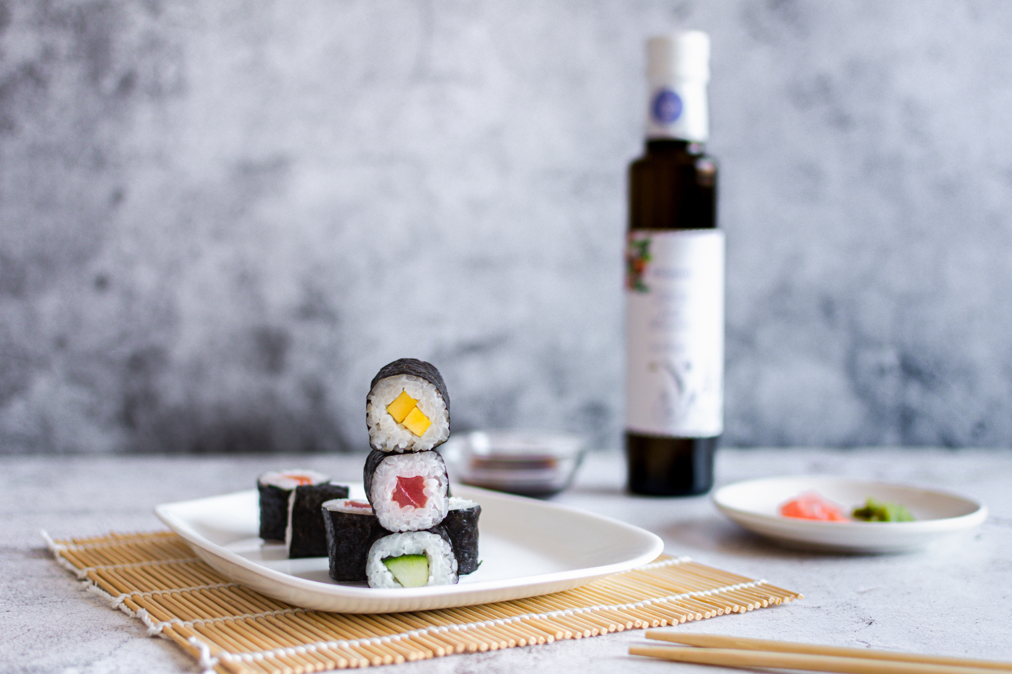 6. En una estora de bambú comencem a muntar els rotlles de sushi. Posem una làmina de film transparent i col·loquem les algues nori amb la part brillant de cara a baix, de manera que les vetes d'aquestes i la direcció dels pals de l'estora sigui la mateixa.