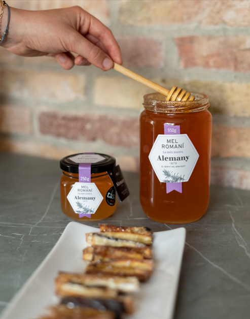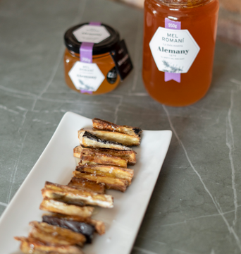 9. Servim les tires en un plat i les reguem amb la Mel de romaní Alemany, just abans de servir-les.