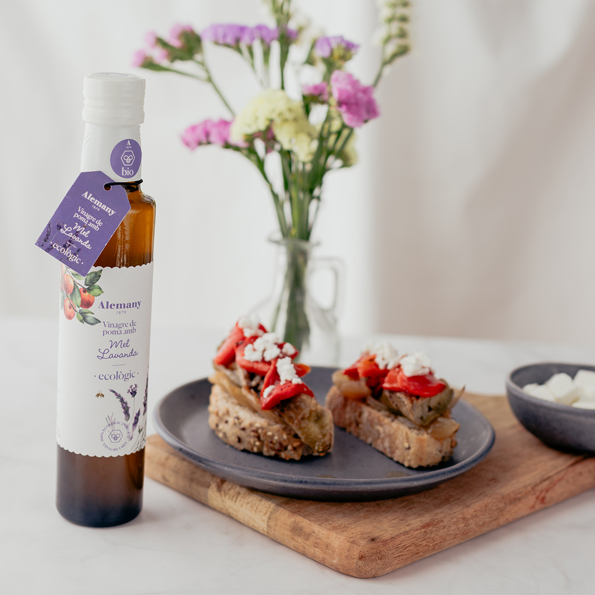 8. En un plat posem les llesques de pa untades amb OOVE i a sobre hi posem el pebrot i l'albergínia escalivada. Ho salpebrem i ho reguem amb un raig de Vinagre de poma ecològic amb mel de lavanda Alemany.