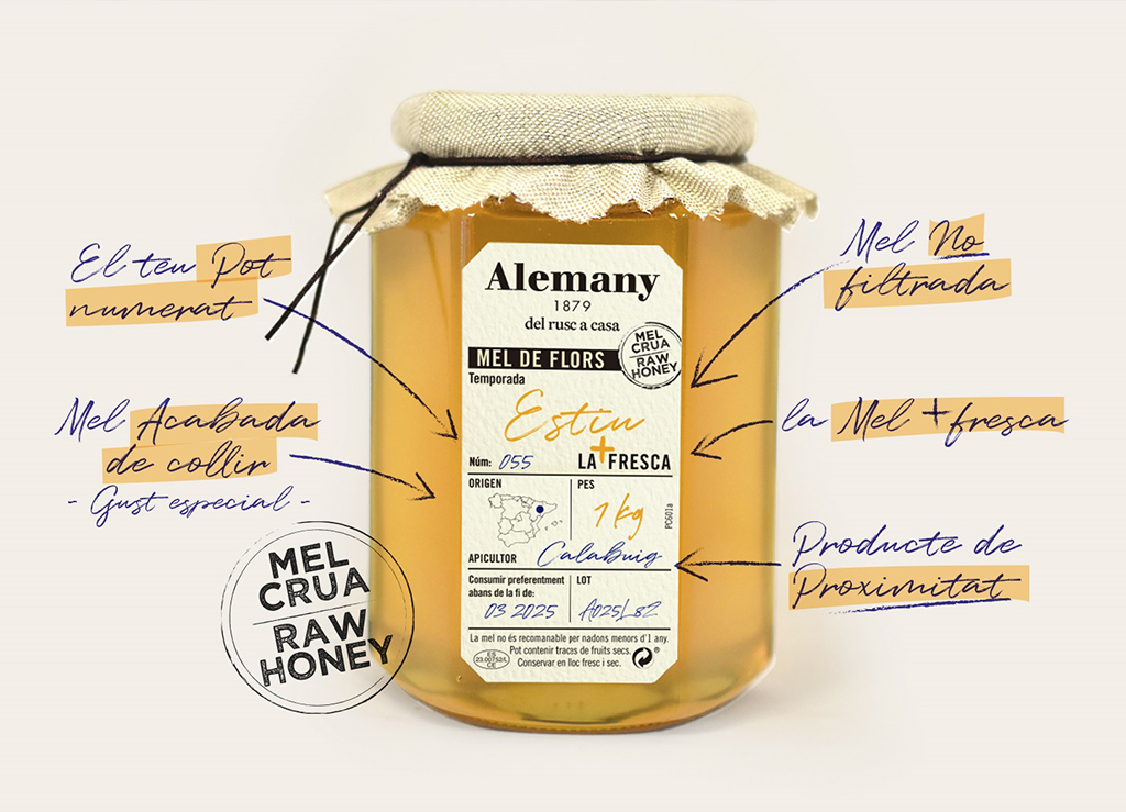 A Alemany, hem seleccionat la Mel d’Estiu de l’apicultor Francesc Calabuig de Moixent (País Valencià) que practica la transhumància. La Mel d’Estiu Alemany, que forma part de la iniciativa ‘Del rusc a casa’, és un nou concepte de consum de mel fresca del territori acabada de collir i que portem de l’apicultor a casa dels subscriptors.